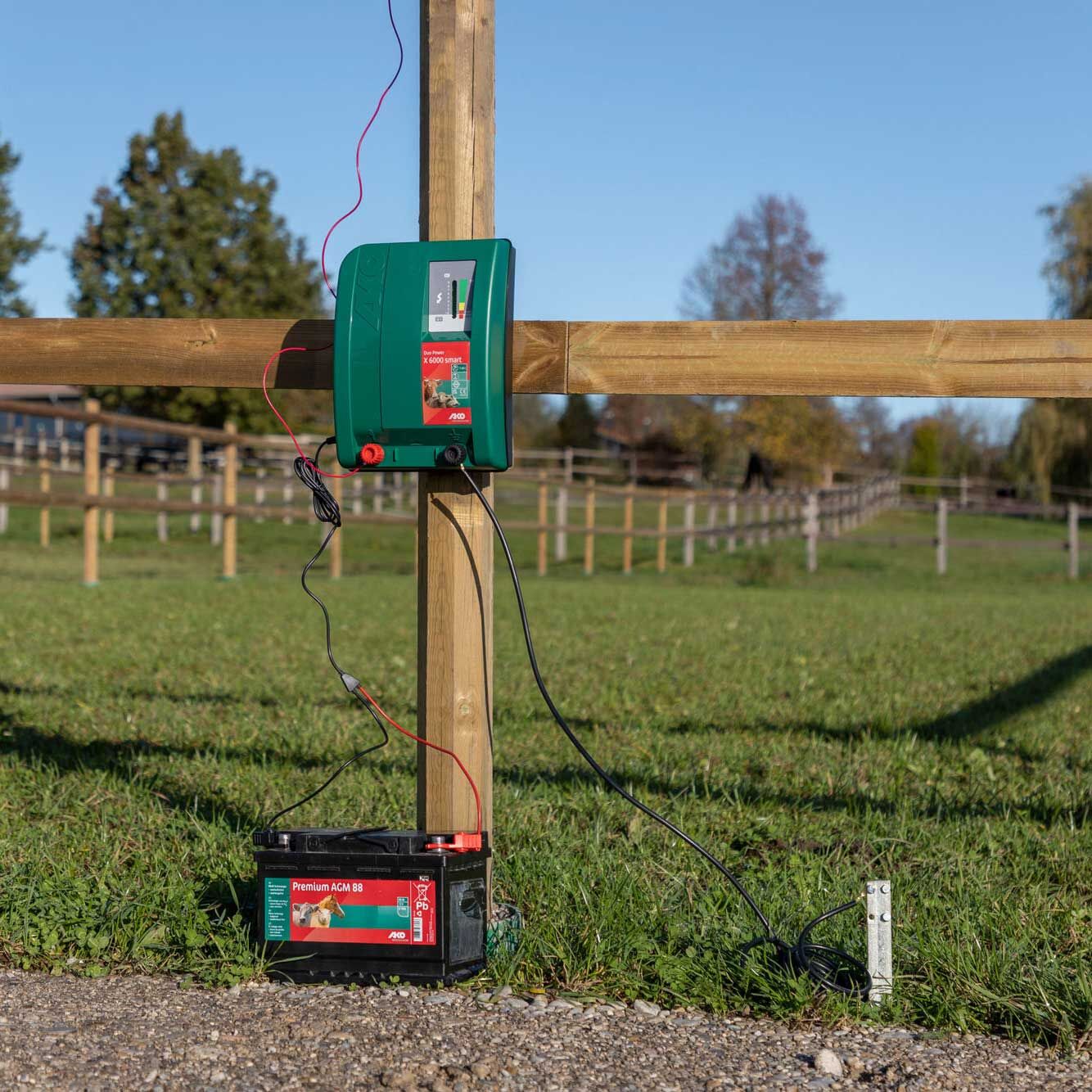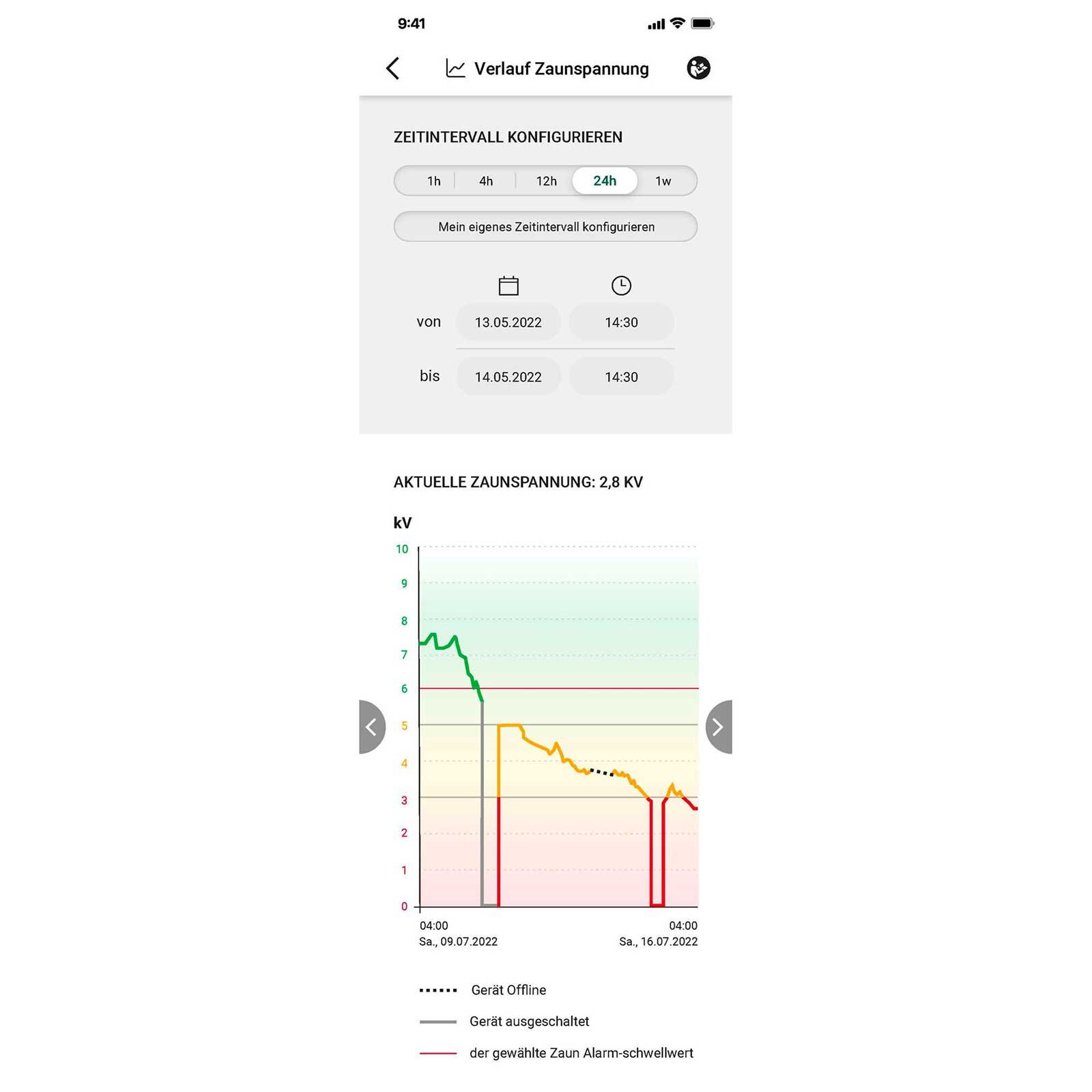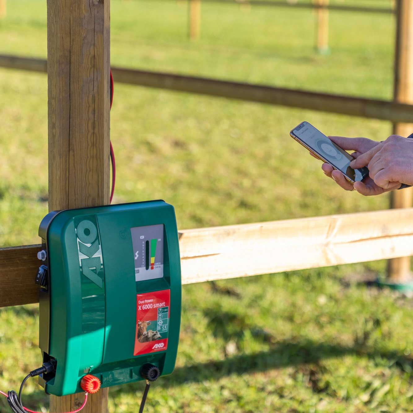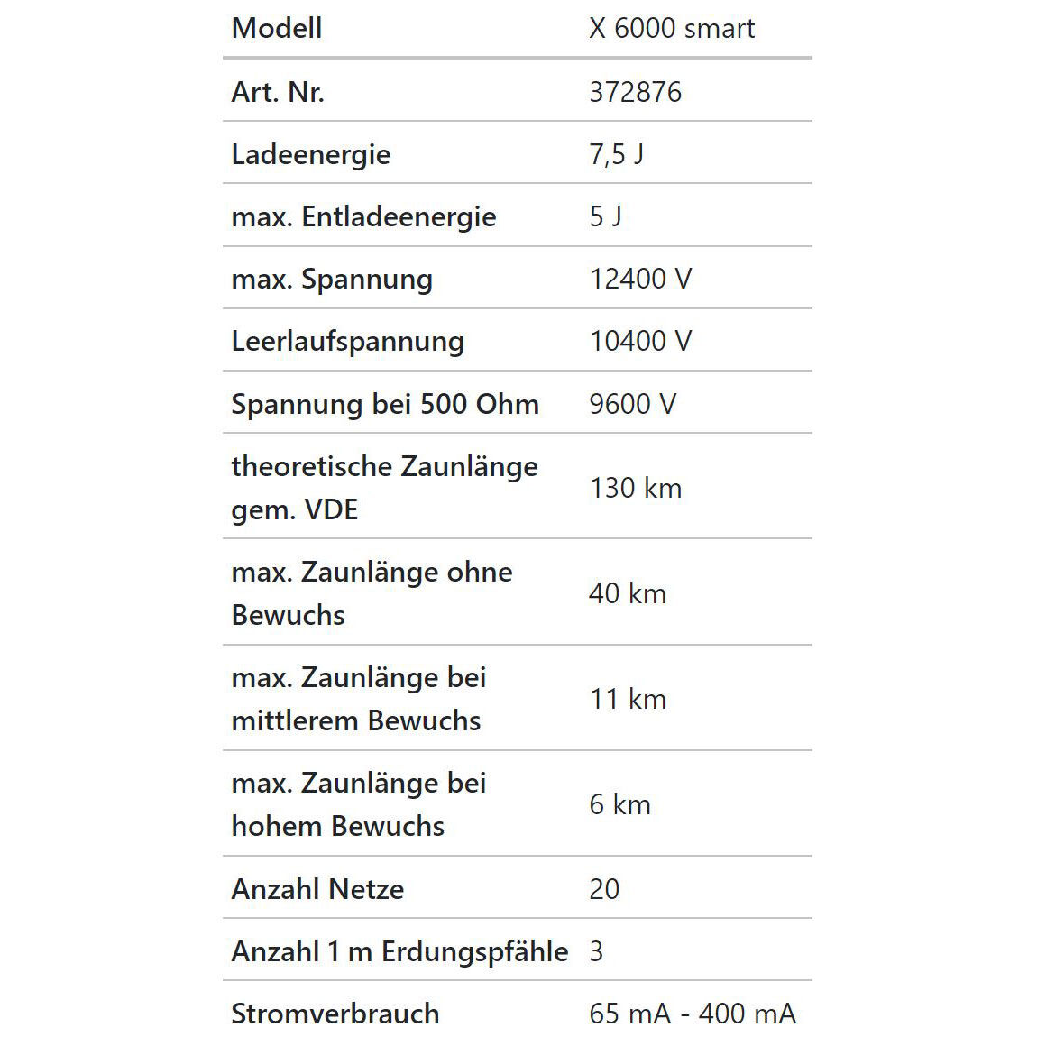 Das neue Duo Power X 6000 smart verfügt über eine direkte Anbindung an die Cloud/Internet (nicht per WLAN) und ermöglicht die einfache, distanzunabhängige Überwachung und Steuerung von Zaunanlagen. Das Gerät lässt sich direkt per Mobilfunk steuern. Somit ist kein Zusatzgerät oder WLAN in Reichweite des Gerätes erforderlich. Das Weidezaungerät kann per kostenloser App vom Smartphone als auch im Browser vom Computer aus gesteuert und überwacht werden. Bei Problemen am Zaun (z. B. bei Unterschreitung der Mindesthütespannung), am Gerät oder bei schwachem 12 Volt Akku, werden Sie als Anwender per Push-Nachricht in Echtzeit alarmiert. In der App bekommen Sie sowohl den aktuellen Zustand als auch historische Verläufe von Zaun- und Versorgungsspannung mitgeteilt. Sie können das Weidezaungerät per App EIN/AUS schalten, Alarmschwellen verändern (z. B. Schwelle der Mindesthütespannung kann individuell eingestellt werden) und die Ausgangsleistung seinen Bedürfnissen anpassen. GPS-Ortungsfunktion integriert - zum Lokalisieren des Gerätes, insbesondere bei Diebstahl - sobald das Gerät an eine Stromquelle angeschlossen ist. Mit High/Low/Aus-Schalter für 2 verschieden starke Ausgangsleistungen. Solarunterstützung möglich. TIPP: Durch eine Reduzierung der Ausgangsleistung per App lässt sich die Stromaufnahme des Gerätes reduzieren. Ladeenergie 7,5 J. Max. Entladeenergie 5 J. Max. Spannung 12.400 V. Leerlaufspannung 10.400 V. Spannung bei 500 Ohm 9.600 V. Theoretische Zaunlänge gem. VDE 130 km. Max. Zaunlänge ohne Bewuchs 40 km. Max. Zaunlänge bei mittlerem Bewuchs 11 km. Max. Zaunlänge bei hohem Bewuchs 6 km. Mind. 3 Erdungspfähle 1 m sind zu verwenden. Stromverbrauch 65 - 400 mA. Lieferumfang: 1x 12/230 V Weidezaungerät Duo Power X 6000 smart inkl. unbegrenzter LTE-Nutzung, 1x 230 V Netzteil, 1x 12 V Anschlusskabel, 1x Zaun-/Erdanschlusskabel, 1x Warnschild.