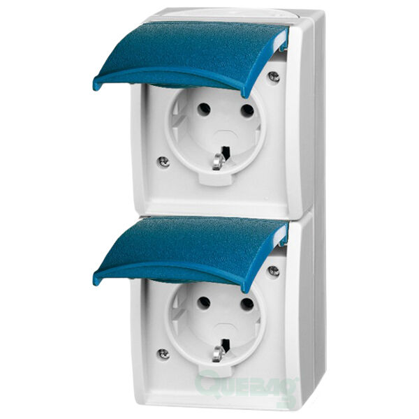 Mit Klappdeckeln. Mit Steckanschluss. Vorverdrahtet. 2 P + E, Nennspannung: 250 V. Nennstrom: 16 A. Schutzart IP 44. Bauart: Aufputz.