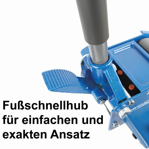 Robuster Rangierheber für den ambitionierten Einsatz. Die niedrige Aufnahmehöhe von 75 mm bietet ein breites Anwendungsfeld auch bei tiefergelegten Fahrzeugen oder Fahrzeugen mit Seitenschwellern. Der integrierte Fußschnellhub erleichtert den Ansatz am Fahrzeug und in Verbindung mit der stabilen und kompakten Bauform eignet sich dieser Heber für dem ambitionierten Privatmann ebenso, wie für den täglichen Einsatz in der Werkstatt. Mit Ventilsteuerung, Doppelkolbensystem, Stahlrädern, Pumpstangenschutz gegen das Anstoßen am Fahrzeug und Einlagesattelkissen. Plus 15 Euro Frachtzuschlag.