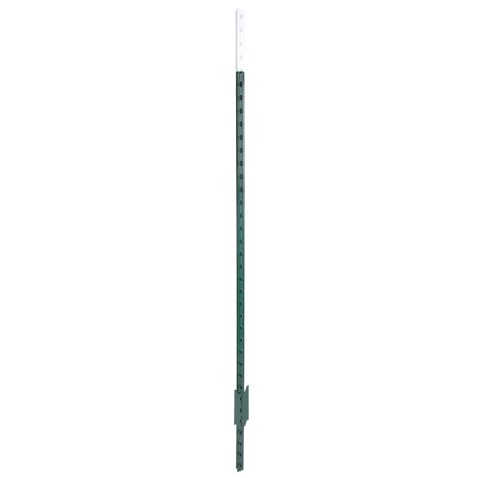 Leicht einzuschlagende, qualitativ hochwertige T-Pfosten für den langjährigen Einsatz. Über die gesamte Länge verfügen die Pfähle alle 5,5 cm über massive Noppen zum Anbringen von Zubehörteilen. Eine robuste Fußplatte gibt dem Pfahl sicheren Halt. Die Lackierung der Pfähle garantiert eine hohe Witterungsbeständigkeit. Wir empfehlen in den Ecken jeweils ca. 30 cm längere T-Pfosten zu verwenden. Die Isolatoren lassen sich in der gewählten Höhe jeweils durch Aufklippen sicher am T-Pfahl fixieren. Grün/weiß lackiert. Einschlagtiefe ca. 40 cm. Ideal für Pferde-, Rinder- und Wildzäune.