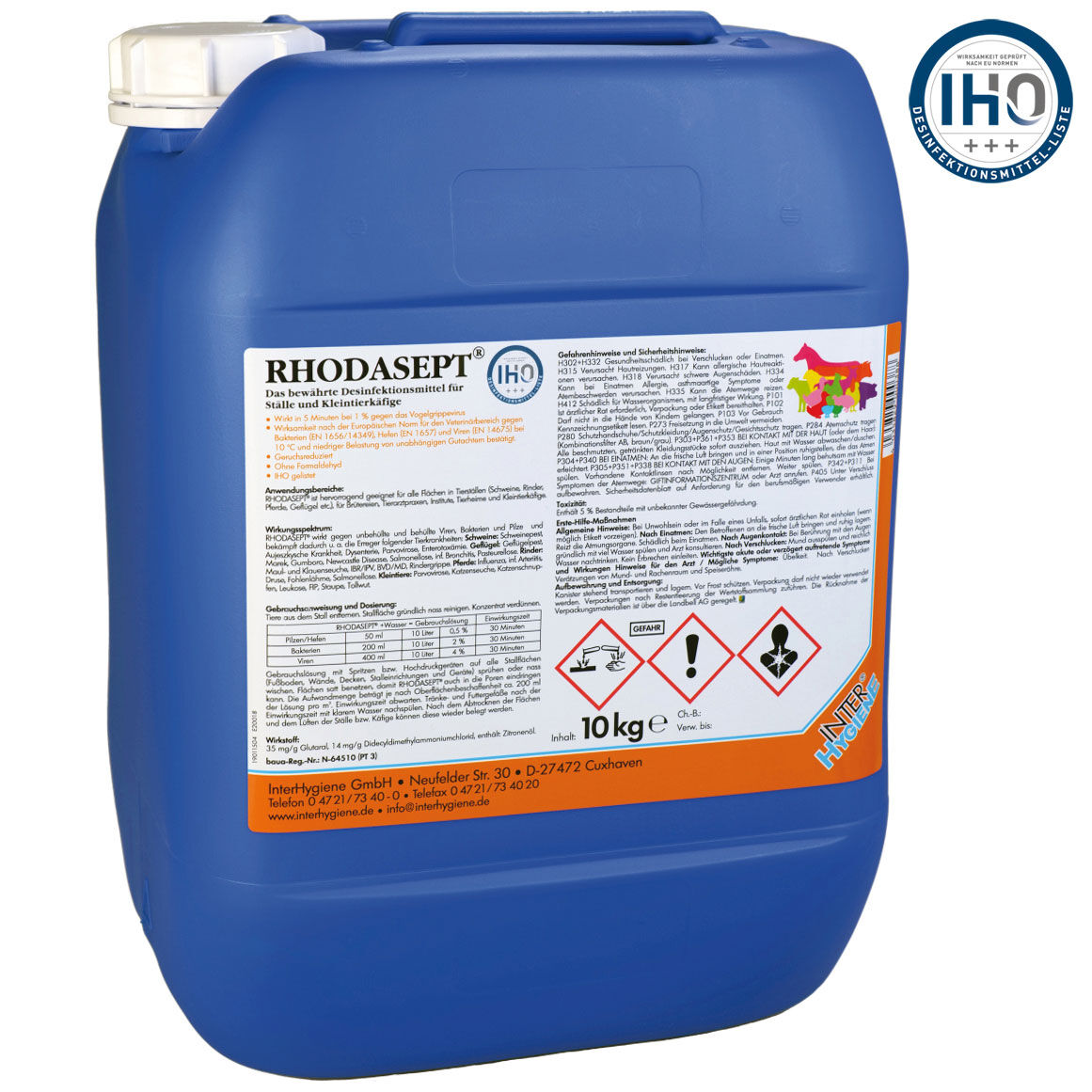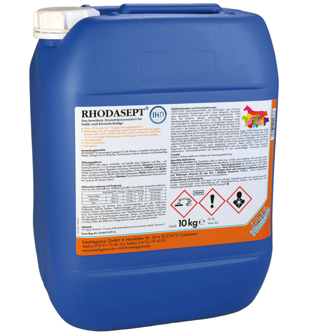 Das bewährte Flächen-Desinfektionsmittel für Kleintierkäfige und Ställe sowie für den industriellen öffentlichen Bereich u.a. in der Nutztierhaltung, Tierarztpraxen, Transportfahrzeugen, Stiefeln, Fußmatten, etc. Wirksamkeit nach der Europäischen Norm für den Veterinärbereich gegen Bakterien, Pilze (Hefen) und Viren bei +10° C und niedriger Belastung von unabhängigen Gutachtern bestätigt. Geruchsreduziert. Ohne Formaldehyd. Anwendung: nass wischen oder in Hochdruck- bzw. Sprühgeräten aussprühen. IHO gelistet. Begutachtete Wirkung gegen das Vogelgrippevirus schon bei 1% in 5 Minuten.