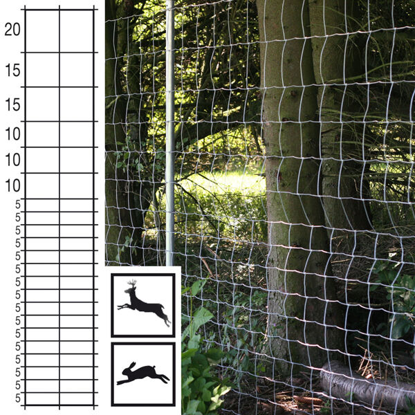 Ein speziell den forstwirtschaftlichen Bedürfnissen angepasstes Knotengeflecht aus dickverzen Stahldrähten. Abstand Vertikaldrähte 15 cm. Kopf- und Fußdraht: 2,0 mm. Fülldrähte längs und quer: 1,6 mm. Länge 50 m. Hasendicht.