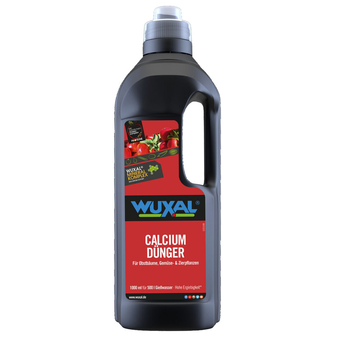 Calciumchloridlösung mit Mangan und Zink. Der WUXAL Calciumdünger dient der Calciumversorgung von Obstbäumen und Gemüsepflanzen. Er beugt Stippe bei Äpfeln und Blütenendfäule bei Tomaten vor und stärkt die Zellwände. Dadurch wird die Resistenz gegen Schädlinge und Pilze verbessert. Auch geeignet für Zierpflanzen, die Calcium in ihren Zellen einlagern, wie z. B. Kakteen und andere Sukkulenten. 1 l ausreichend für ca. 500 l Gießwasser. Nährstoffgehalt: 15 % CaO, 0,5 % Mn, 0,5 Zn.
